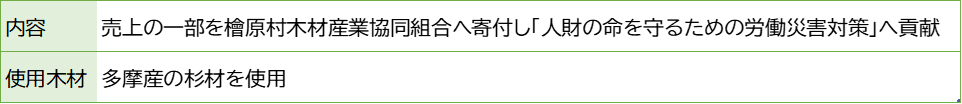国産木材活用の気運が高まる一方で、課題として慢性的な人材不足があげられます。日本は伐採適齢期を迎えた森林が数多くありますが、伐採する技術者の不足や次世代の森林を守り育てる人材が不足しています。特に林業は他の業種に比べると、労働災害発生率が全産業の中で最も高く、人財確保が難しい現状があります。今回の本取り組みでは、檜原村木材産業協同組合へ寄付を行い、より安全により安心に働ける環境整備・講習などに活用していただきます。